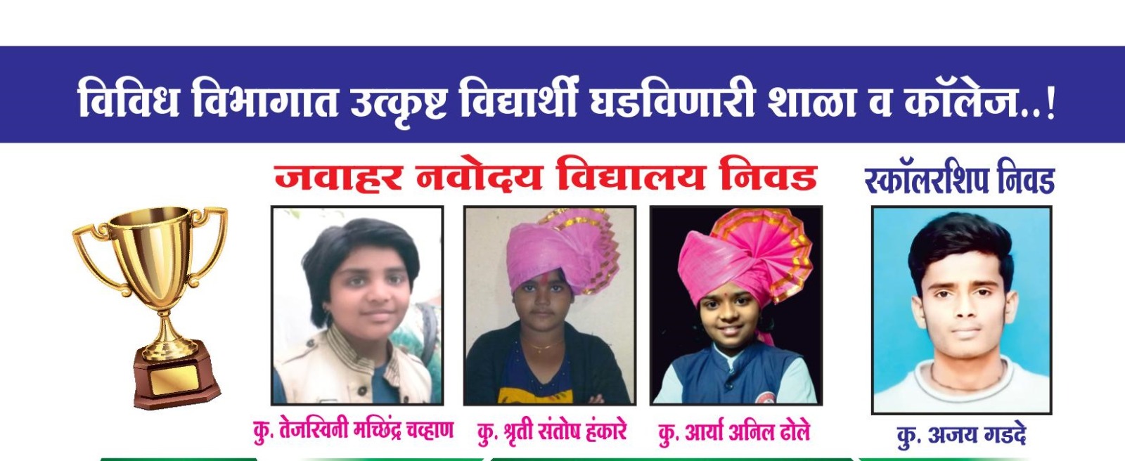 • 15 वर्षे शैक्षणिक क्षेत्रात अग्रेसर कार्यरत असलेली व शेकडो विद्यार्थ्यांना सरकारी नोकरी मिळवून देणारी निवसी शाळा.